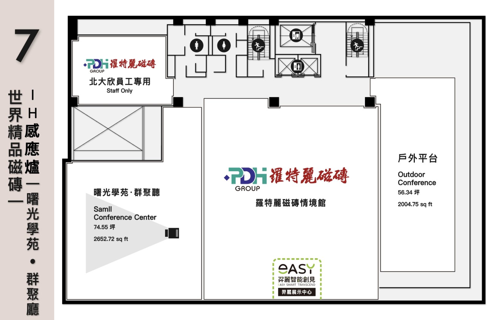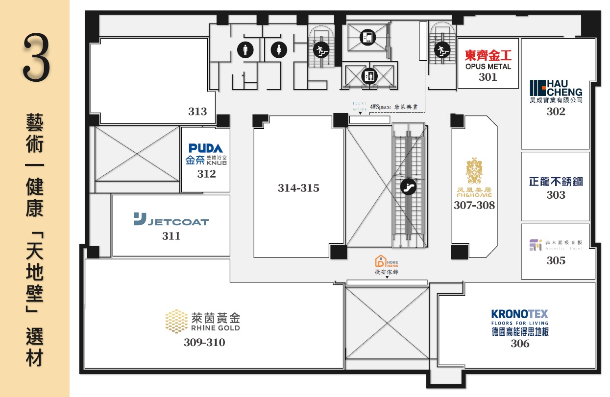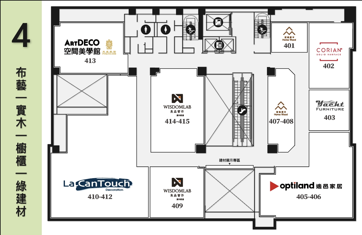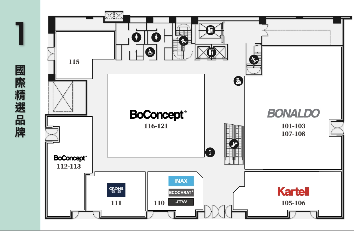 樓層與品牌簡介 樓高七層,每層樓空間300多坪 1到6樓為室內家居傢飾建材,由高端品牌進駐,7樓做為產官學界交流的平台,規劃為舉辦各項活動的場所,同時具備的功能為產學教育會議廳、產品發表與展示空間。 1F 2F 3F 4F 5F 6F 7F 8F 1F 國際精選品牌 創空間 Creative CASA INAX伊奈衛浴 2F 全球時尚傢居 創空間 Creative CASA 智慧屋控制系統 3F 藝術|健康「 天地壁 」選材 東齊金工 昊成/恆康地暖/磐多魔 正龍不鏽鋼 旭利興菲米諾吸音板 Kronotex德國高能得思地板 ArtDeco美學家飾/鳳凰美居 萊茵黃金 JETCOAT協承昌 卜大/金奈 捷安傢飾 4WSpace康萊 4F 布藝|實木|櫥櫃|綠建材 宏森美學檜木事業 杜邦TM可麗耐®實體面材 亞的有限公司 Optiland 適邑家居 良品智作原木傢俱 LaCanTouch長堤家居 ArtDeco美學家飾/鳳凰美居 5F 時尚客製化廚具|世界精品磁磚|智能生活|地暖 羅特麗磁磚 Gorden高登廚具 尊櫃國際KII/北二高實業 AIK+智慧居家/智慧廚房 COMPAC西班牙康沛石 五陽地暖 6F 無甲醛全室裝修 Lamett樂邁石晶 7F 世界精品磁磚|IH感應爐|曙光學苑 ˙ 群聚廳 羅特麗磁磚情境館 羿麗智能創見 群聚廳 戶外平台 8F 頂樓空間|觀景台 戶外平台