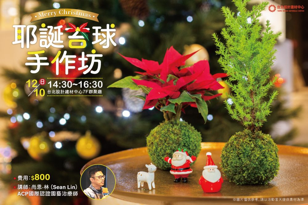 - 手作療癒耶誕苔球好評加開!! 延續週年慶生態瓶課程,再次邀請ACP國際認證園藝治療師:尚恩 林 (林幼青 Sean Lin) 在耶誕節前… 閱讀全文: 手作療癒耶誕苔球