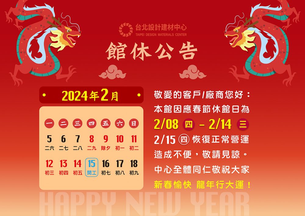 - 【公告】2024春節休館日春節期間營業時間調整如下: 2/08(四)–2/14(三) 春節休館2/15(四) 恢復正常營運 10:30-19:30… 閱讀全文: 【公告】2024春節休館日