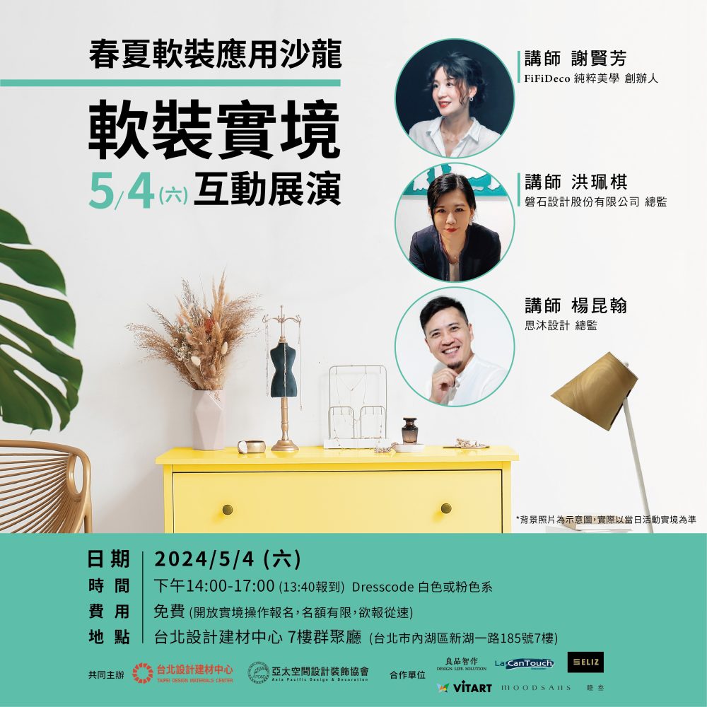 - 【春夏軟裝應用沙龍 x 軟裝實境互動展演】軟裝設計也需要跟著季節變換, 台北設計建材中心與 亞太空間設計裝飾協會apd&d 共同主辦, 利用軟裝,家具、擺… 閱讀全文: 【春夏軟裝應用沙龍 x 軟裝實境互動展演】